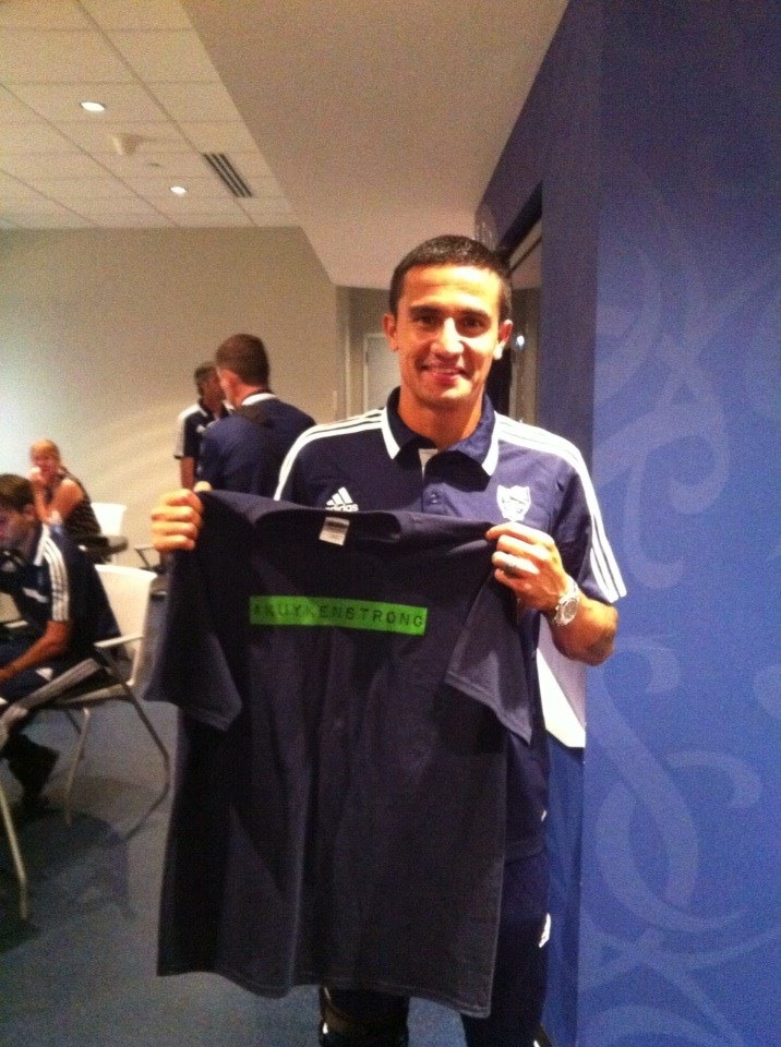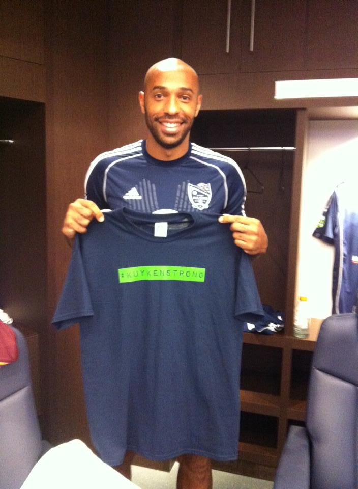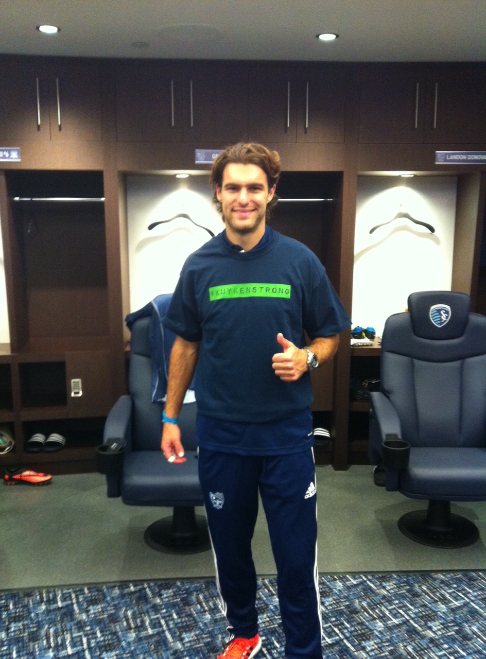 The MLS All-Stars are as excited as we are about the release of the new Kuykenstrong T-shirts. A few players decided to wear them when they faced A.S. Roma Wednesday night. Thanks to Landon Donovan, Thierry Henry, Graham Zusi, Tim Cahill, and our friends at Sporting Kansas City for keeping Shawn on the pitch and in their hearts.